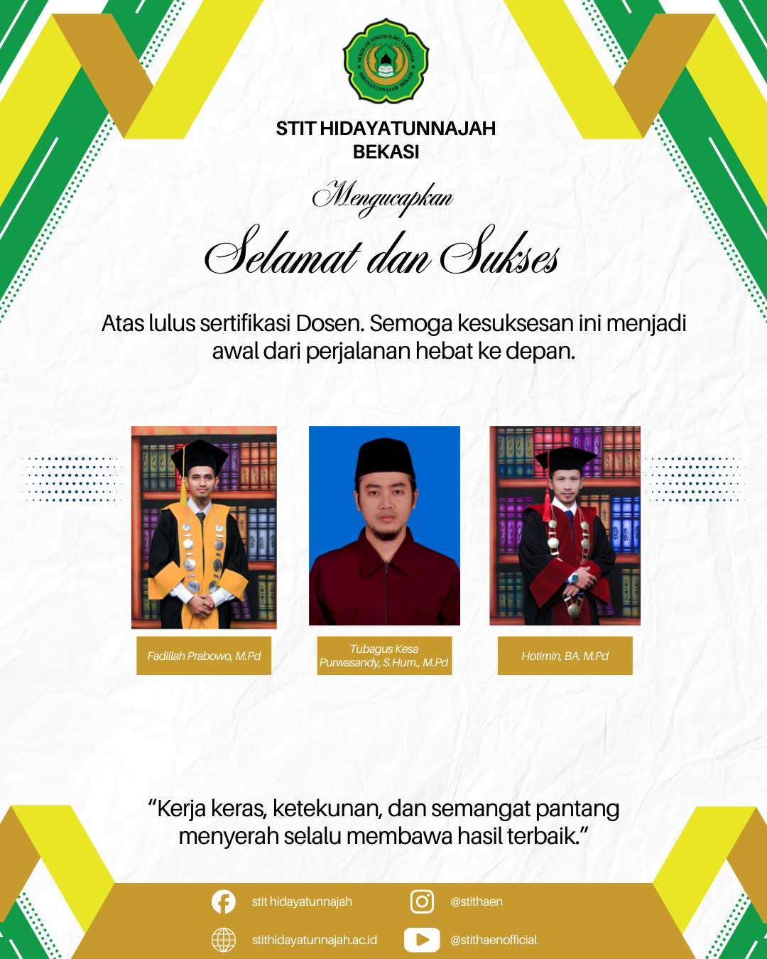 STIT Hidayatunnajah Bekasi mengucapkan selamat dan sukses kepada para dosen yang telah lulus Sertifikasi Dosen, yaitu: Fadillah Prabowo, M.Pd. Hotimin, BA., M.Pd Tubagus Kesa Purwasandy, S.Hum., M.Pd. Sertifikasi dosen