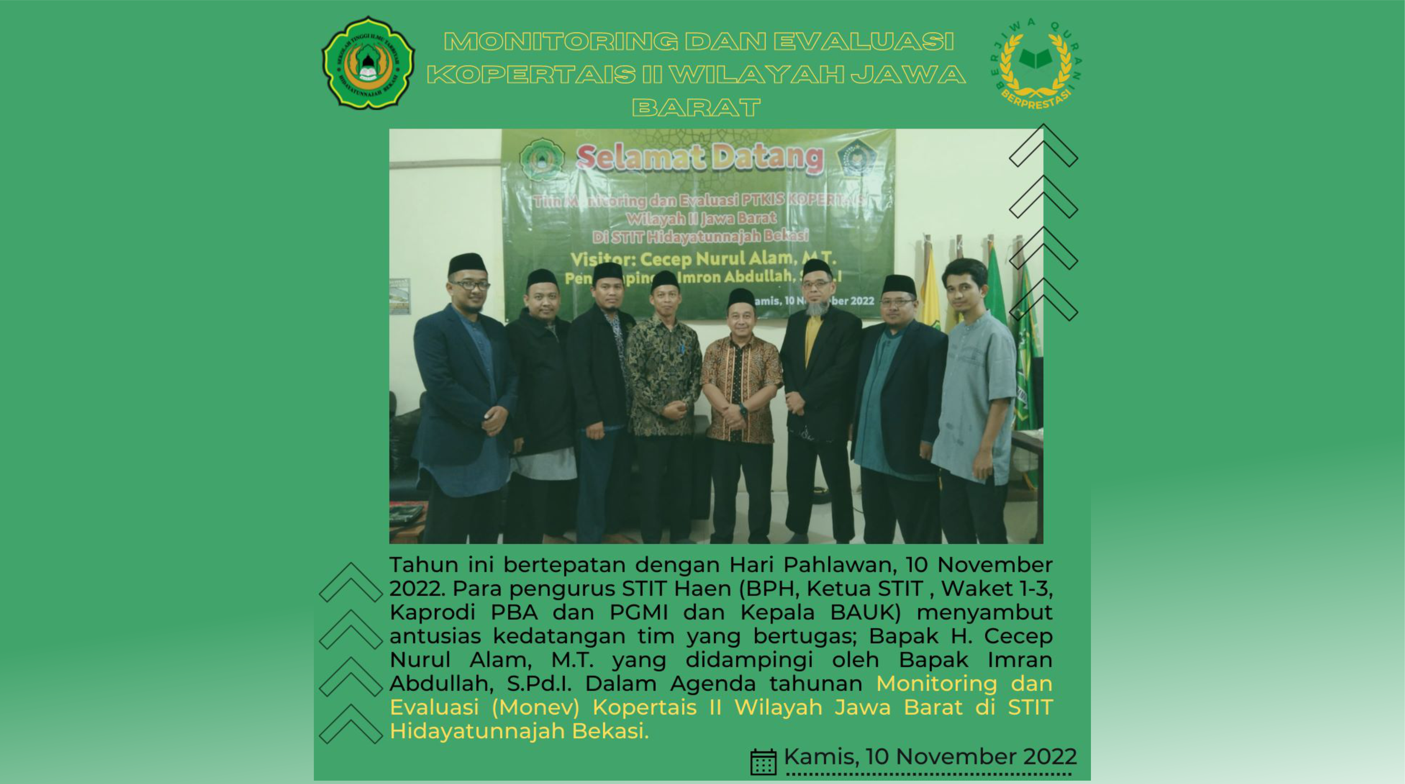 Agenda tahunan Monitoring dan Evaluasi (Monev) Kopertais II Wilayah Jawa Barat di Sekolah Tinggi Ilmu Tarbiyah Hidayatunnajah Bekasi (STIT Haen) tahun ini bertepatan dengan Hari Pahlawan, 10 November 2022. Para pengurus STIT Haen (BPH, Ketua, STIT Haen, Waket 1-3 dan Kepala BAU) menyambut antusias kedatangan tim yang bertugas; Bapak H. Cecep Nurul Alam, M.T. yang didampingi oleh Bapak Imran Abdullah, S.Pd.I.