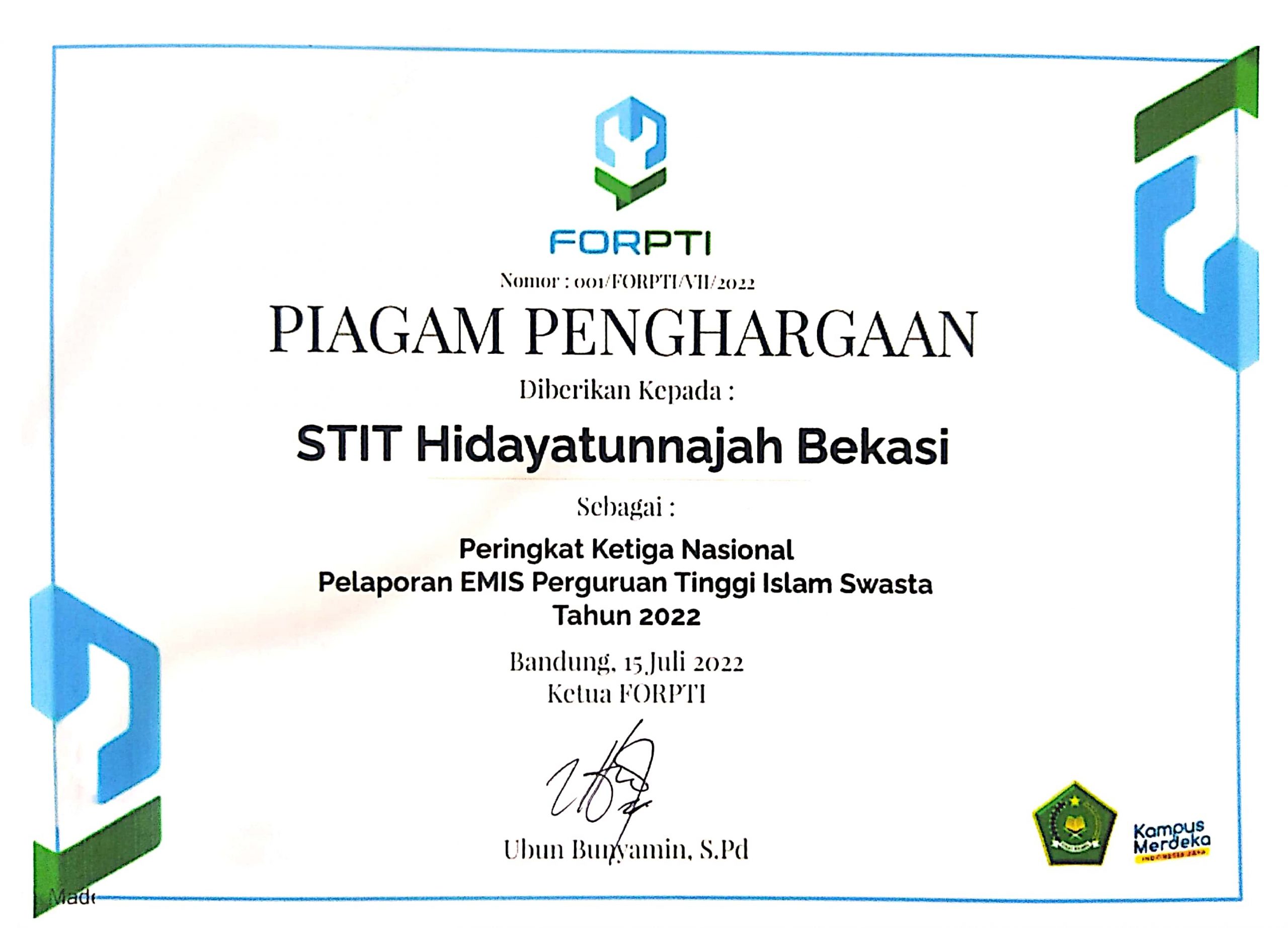STIT Hidayatunnajah Bekasi (STIT Haen) berpartisipasi dalam acara yang diadakan oleh FORPTI di atas. Acara tersebut diselenggarakan pada hari Jum’at s.d. Sabtu, 15-16 Juli 2022 di Hotel Pasar Baru Jl. Otto Iskandar Dinata No.81-89, Braga, Kec. Sumur Bandung. Pada momen akhir workshop tiba waktunya pengumuman lembaga terbaik dalam pengelolaan data EMIS PTKI. Tak disangka dan tak terduga, STIT Haen menempati posisi yang mengejutkan. Meskipun terbilang kampus baru, tetapi prestasi yang diraih cukup membanggakan.