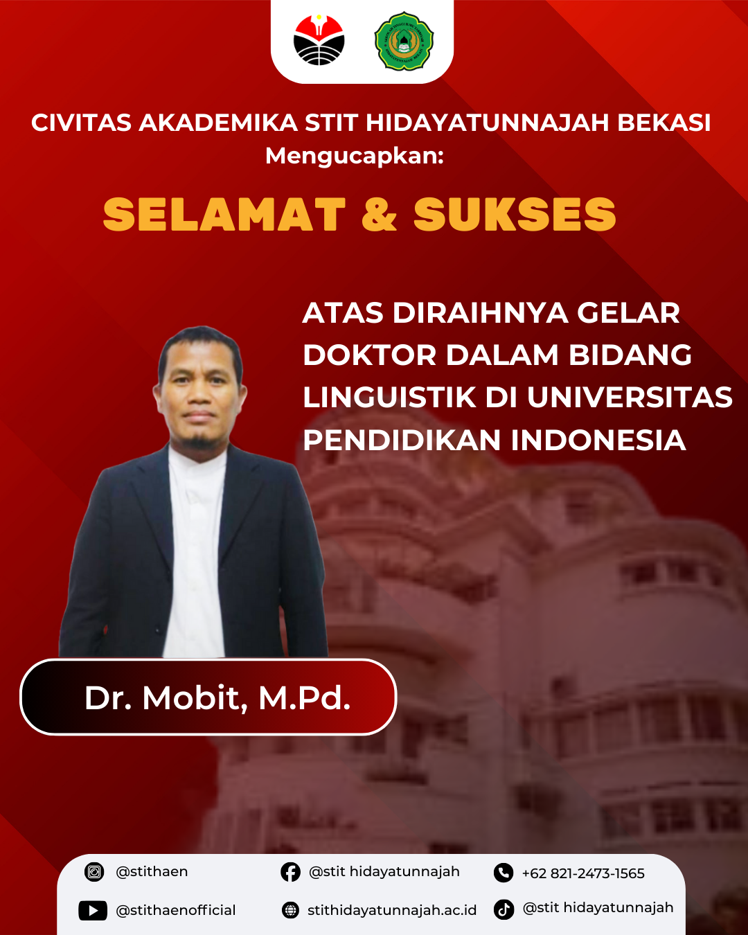 Civitas Akademika STIT Hidayatunnajah Bekasi mengucapkan selamat dan sukses atas diraihnya gelar Doktor (S3) Bidang Linguistik kepada Dr. Mobit, M.Pd. di Universitas Pendidikan Indonesia.