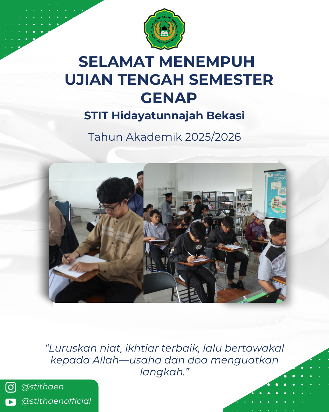 STIT Hidayatunnajah Bekasi mengucapkan selamat menempuh Ujian Tengah Semester (UTS) Genap Tahun Akademik 2025/2026 kepada seluruh mahasiswa/i.